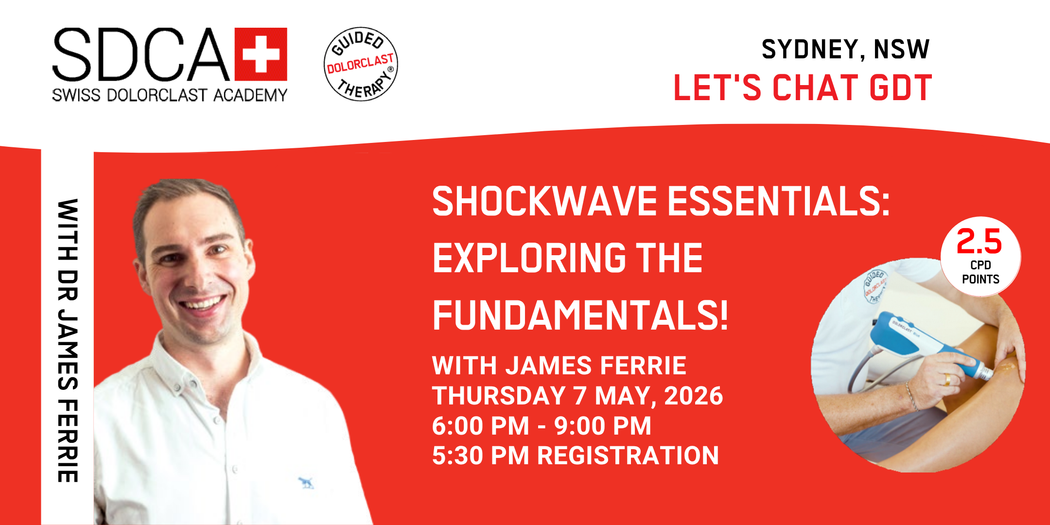 Join us for an engaging evening delving into the fundamentals of Radial and Focused Shockwave Therapy and their transformative impact on patient care and clinic success. This event will also introduce the innovative concept of Guided DolorClast Therapy (GDT) - combining radial, focused shockwave, and high-power laser therapy for unparalleled results.